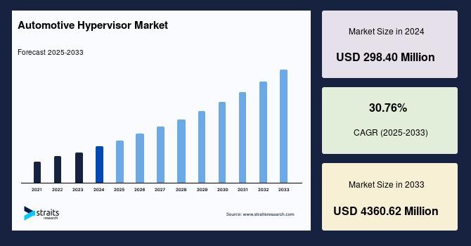 According to StraitsResearch, the global automotive hypervisor market size was valued at USD 298.40 million in 2024 and is estimated to reach USD 4360.62 million by 2033, growing at a CAGR of 30.76% during 2025-2033.